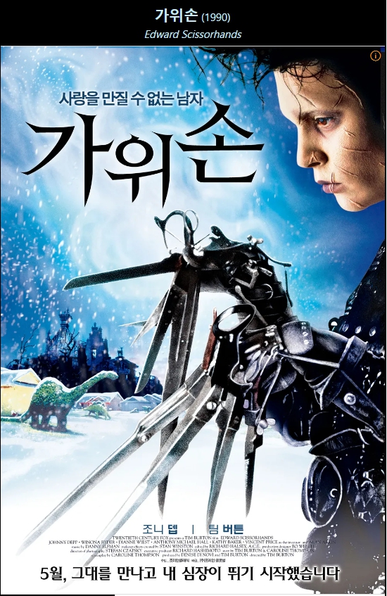 오늘은 1990년에 개봉한 감동의 명작, 가위손 영화를 소개합니다. 이 영화는 마음 따뜻해지는 이야기와 깊은 여운을 남기는 작품으로 많은 이들의 마음을 사로잡았던 영화입니다. 원제는 Edward Scissorhands(가위손 에드워드). 팀 버튼 감독, 조니 뎁 주연이며, 8백만 달러 저예산으로 미국에서 5,636만 달러 대흥행을 거둬들였습니다. 제63회 아카데미 시상식 분장상 후보까지 올랐던 영화 가위손입니다. 가위손 영화는 팀 버튼 감독의 뛰어난 작품 중 하나로 판타지와 드라마의 조합으로 우리에게 잊을 수 없는 여운을 남기는 영화입니다. 이 영화는 특별한 캐릭터와 독특한 분위기로 관객들의 마음을 사로잡습니다. 특히 에드워드라는 주인공의 가위 손질 능력과 인간 본성에 대한 깊은 이해가 이 작품을 더욱 특별하게 만듭니다. 가위손 은 가위로 만들어진 손을 가진 주인공으로 그의 외모와 능력 때문에 사회적으로 소외되어 있습니다. 그러나 그의 내면에는 따뜻하고 순수한 마음이 있어 다른 이들과의 관계에서 큰 영향을 미칩니다. 이 영화는 주인공의 이야기를 통해 우리에게 다양성과 이해의 중요성을 상기시키며, 관객들에게 감동적인 여정을 선사합니다.