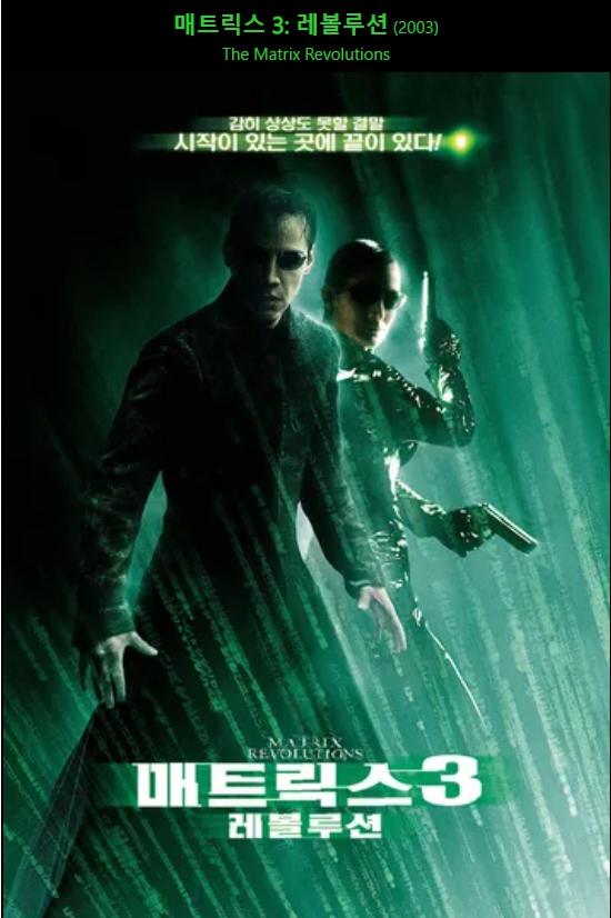 매트릭스3 : 레볼루션 영화 소개 및 영화 줄거리, 영화적 배경, 영화 리뷰카테고리 없음 2024. 4. 28. 09:09반응형